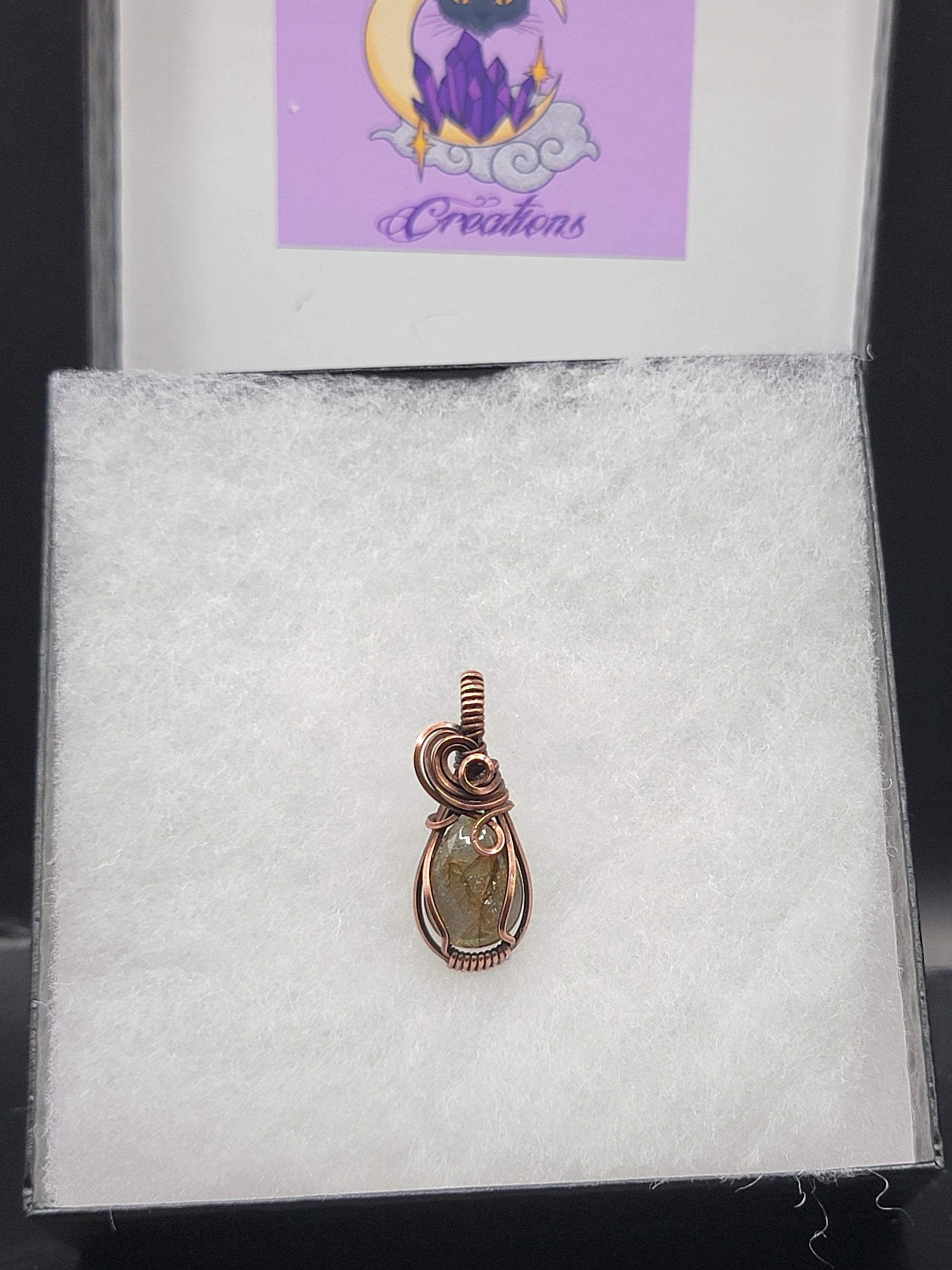 Dainty flashy labradorite wrapped by hand in antiqued copper.