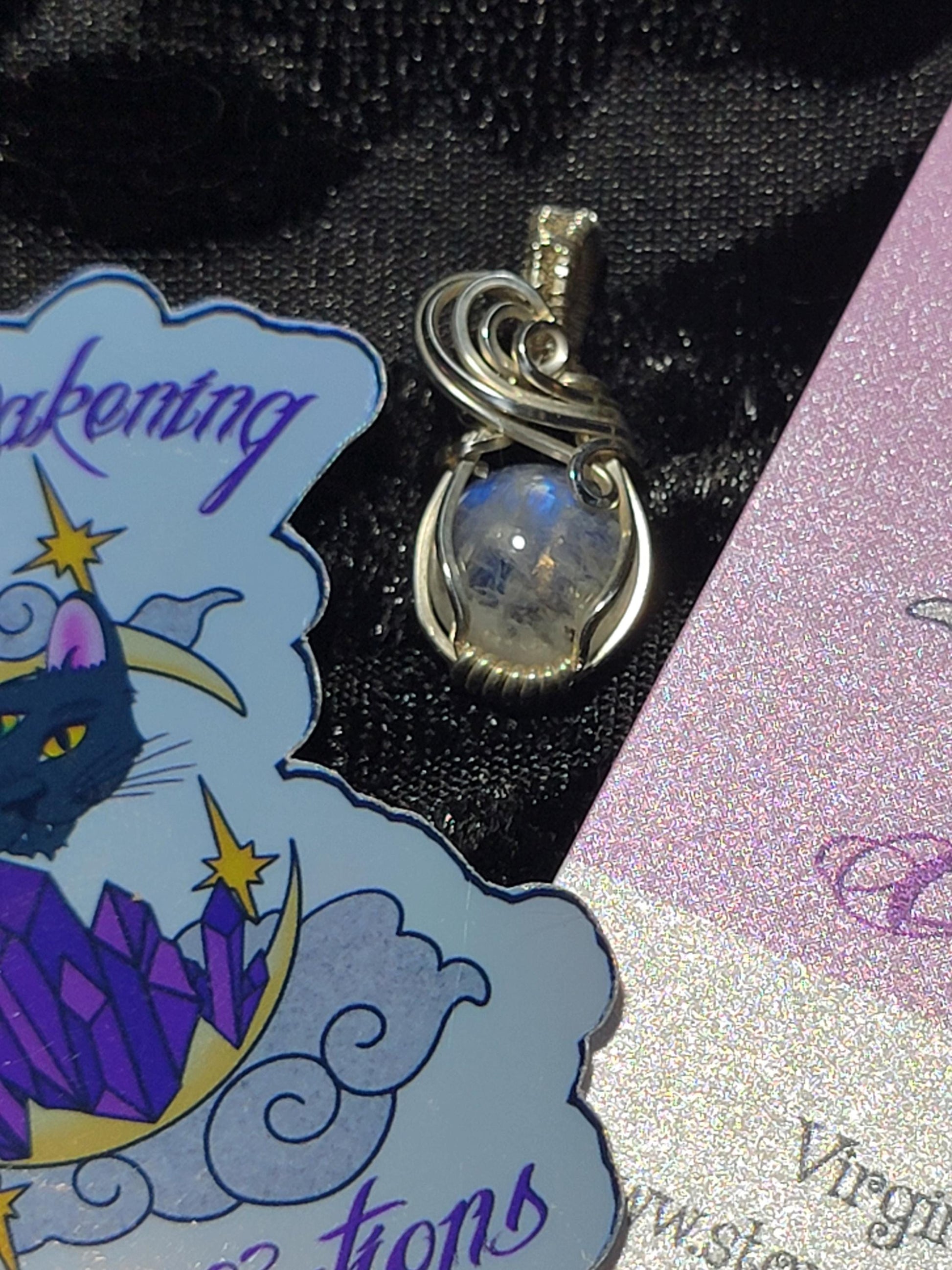 Tiny rainbow moonstone full of lovely blue flash wrapped by hand in .925 sterling silver.