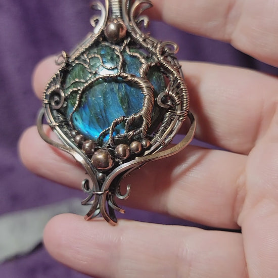 Labradorite with brilliant blue flash wrapped by hand with love in this antiqued copper statement piece featuring a tree of life on the front and crescent moon detail on the back.