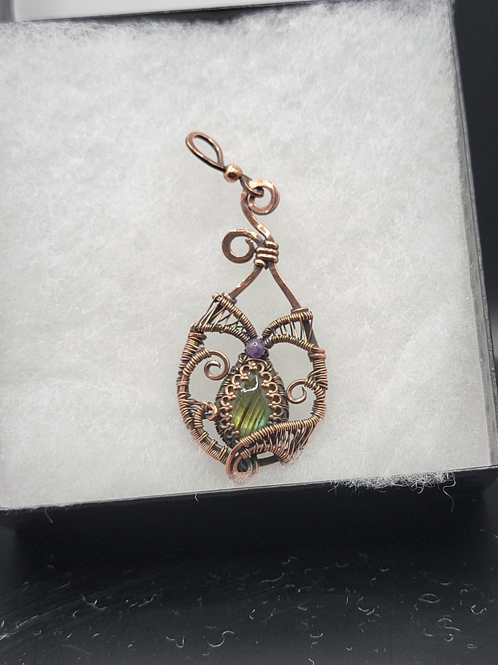 Green flash labradorite with amethyst accent wrapped by hand in swirls of antiqued copper. This one dangles.