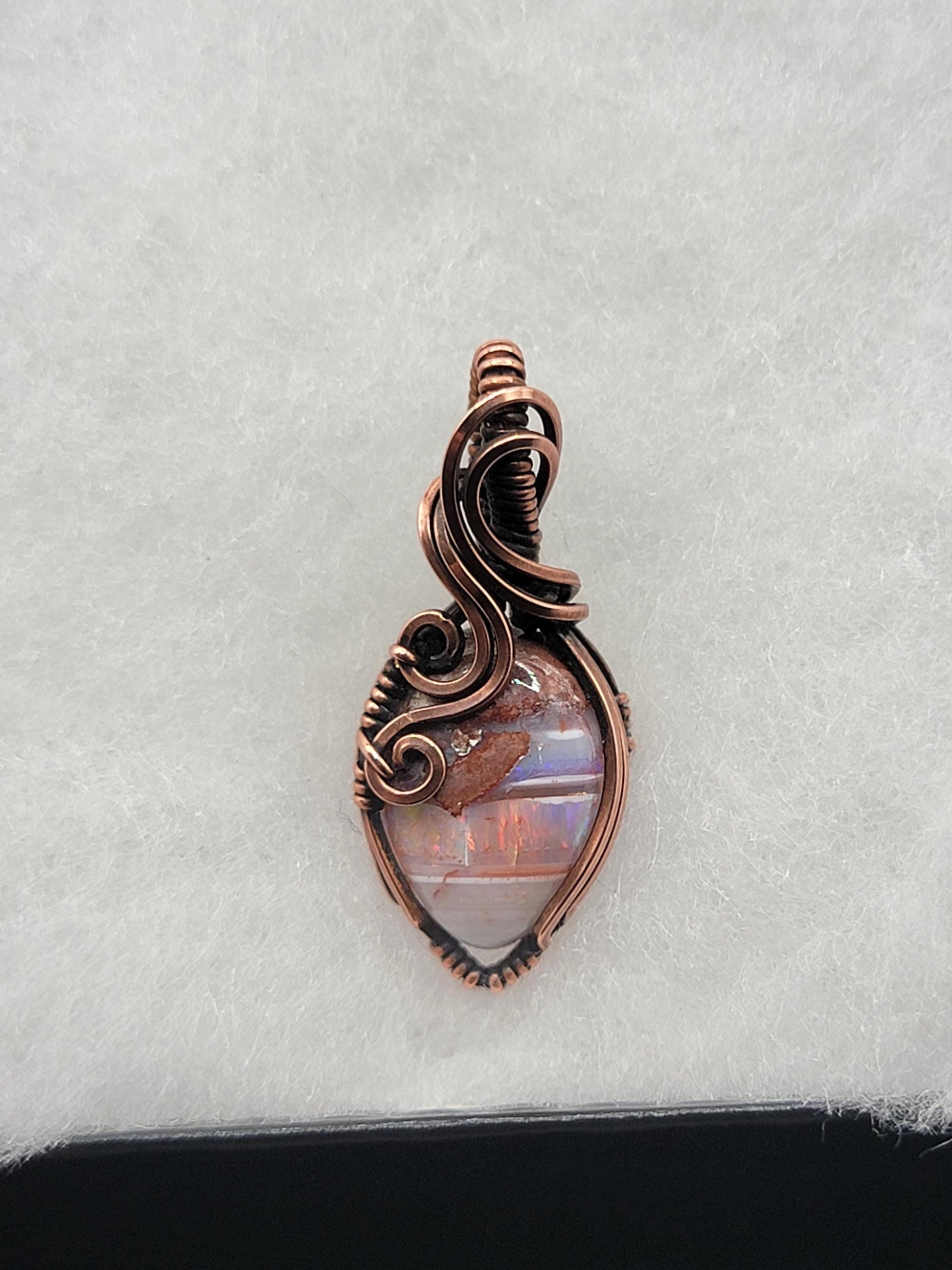 Mexican fire opal with bands of colorful fire wrapped by hand in antiqued copper