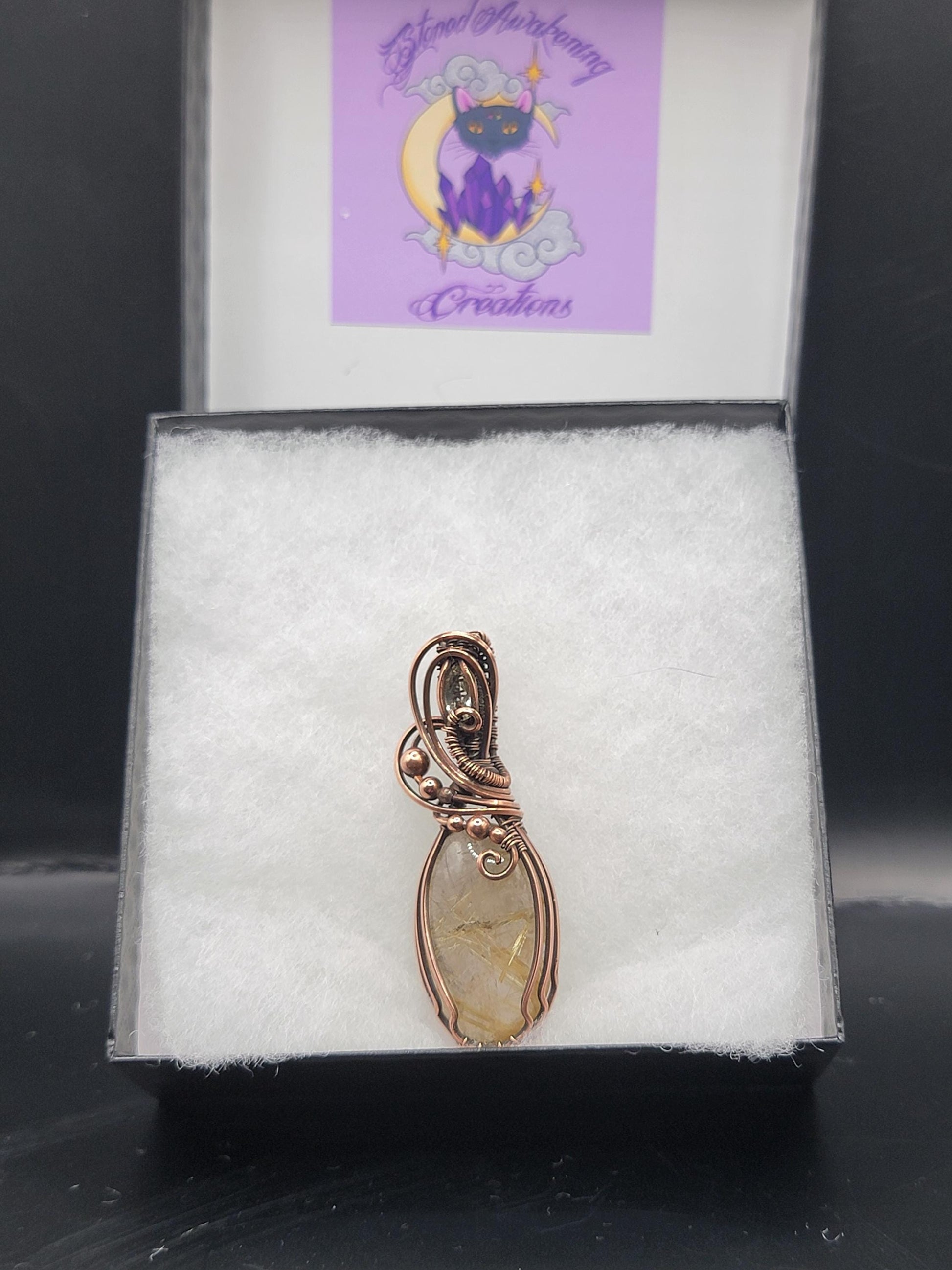 Rutilated quartz with faceted lemon quartz accent wrapped by hand in antiqued copper.